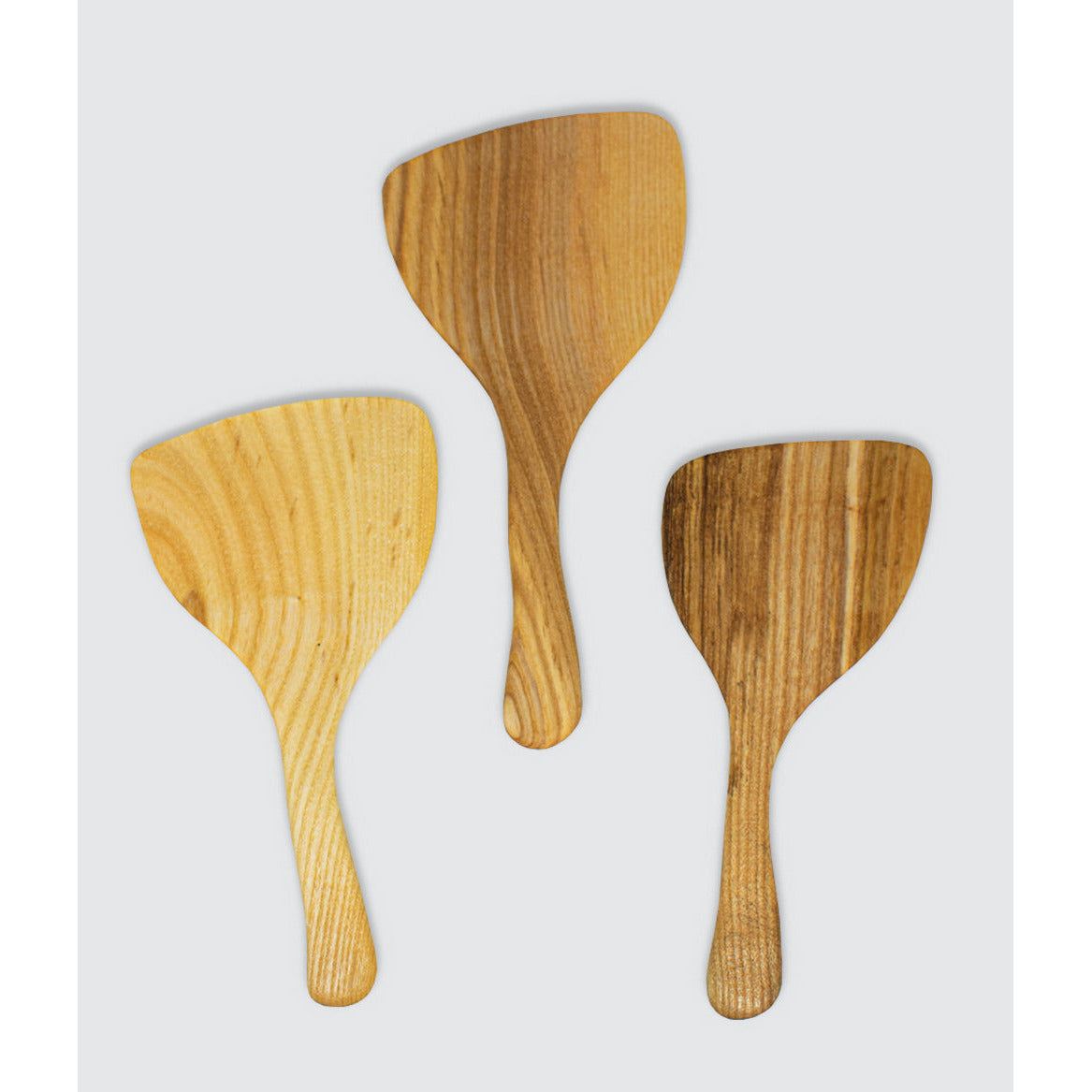 Luksuriøs træspatel lavet af asketræ. På grund af den forbuede hals har spatelen et ekstra behageligt greb. Den mindre størrelse af denne spatel virker virkelig som en forlængelse af din hånd og er ideel til bagning af mindre retter såsom pandekager, æg, svampe osv. Fås også til venstrehåndede! Hver individuel spatel er lavet i hånden af ​​en lille familievirksomhed.
